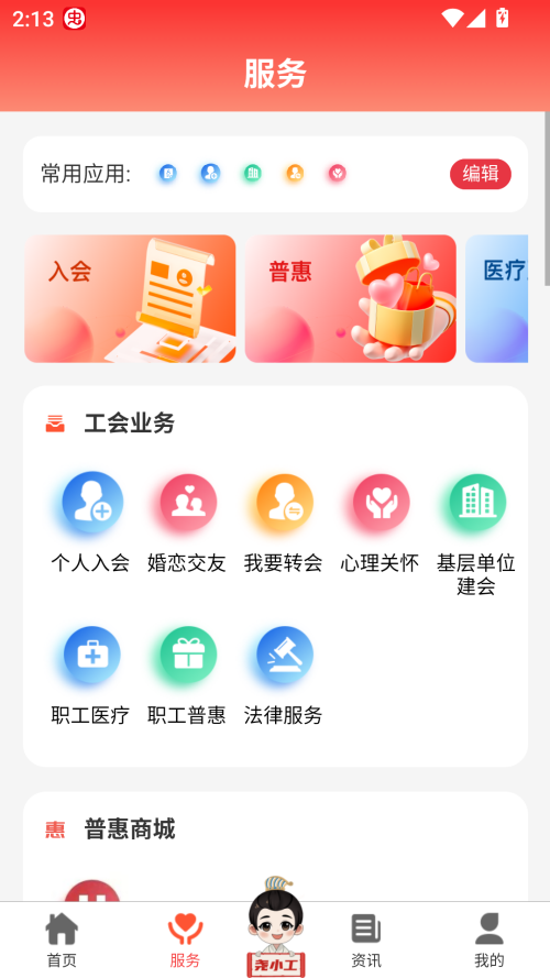 方便职工随时随地找资讯、找组织、找服务、找援助、找专家、找工作、找活动等,形成了线上线下有机结合的互联网+工会普惠性服务一体化建设。忠诚当的事业,竭诚服务职工。