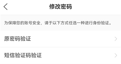 3、你可以选择两种方式验证,【原密码验证】适用于记得密码但需要改密码,【短信验证码验证】适用于忘记密码但要修改密码。我们以【短信验证码验证】为例。