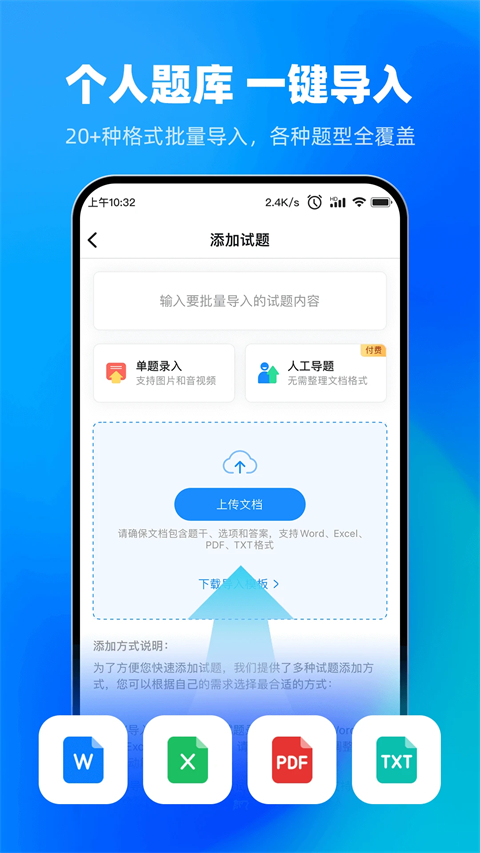 当您在考试宝典中没有找到想要练习的题库时,可以通过我们的网站上传您的自有题库,进行在线刷题练习,如果题目数量大,使用人数多,可以联系客服协助导入。