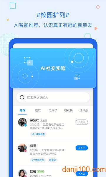 告诉AI你的资料和录制一段音频,我们的算法系统会自动识别你的社交倾向并为你推荐好友,在300万位同学中找到与你契合的真朋友。