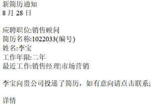 7. 应聘通知迅速及时,有人投递简历手机立刻收到提醒,不会错过好员工。