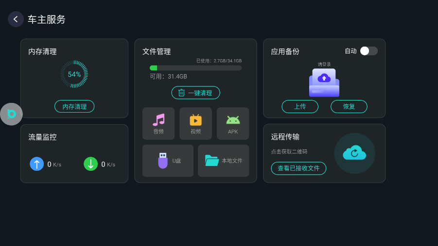 用户点击屏幕下方汽车图标,可以打开车主服务界面,可以使用多种多样的服务。