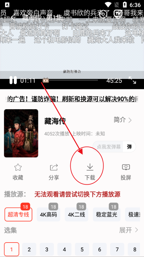 1、点击播放你喜欢的影视剧;在播放界面点击下载图标;