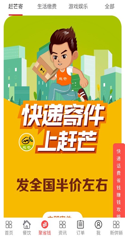5. 生活缴费有电费话费93折省钱活动,赶芒寄件享受全国半价优惠。