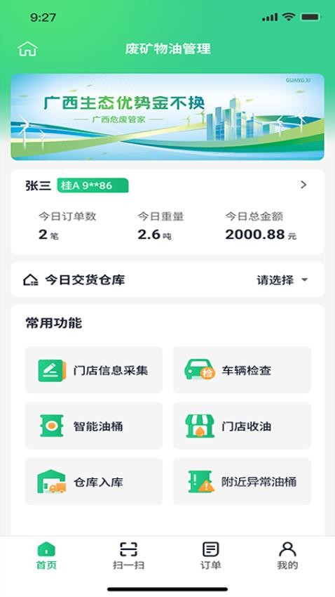 广西危废管家app是一款提供废矿物油回收管理服务的办公软件,软件中涵盖有车辆检查、门店收油、仓库入库、附近异常油桶、智能油桶、门店信息采集等多种功能,方便用户的日常办公使用,用户可以将所有的客户门店信息进行实时采集记录,方便用户快速找到门店上门回收废矿物油,将回收的废矿物油进行仓库入库操作,实时登记仓库的库存详情,便于用户随时查看仓库的库存详情,将全部的订单信息统一化管理,便于用户随时跟进订单进度,将各种订单的最新进度一手掌握,助力用户更好的开展废矿物油回收管理工作,有需要的用户就快来下载广西危废管家官网版使用吧!