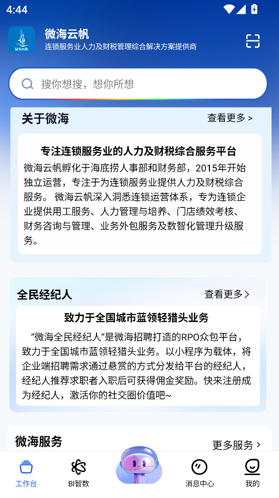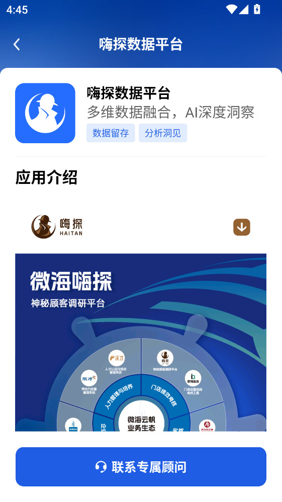 微海云帆是一款面向现代企业数字化转型的综合型智能服务平台,平台构建了名为生态矩阵的线上培育系统,可为企业提供定制化的人力培训与人才发展方案。通过信息峰巢实现应用审批流程线上化及关键通知的聚合呈现,帮助团队高效捕捉核心动态。用户还可随时进行课程与企业咨询服务,获得从知识提升到财税事务的专业响应。