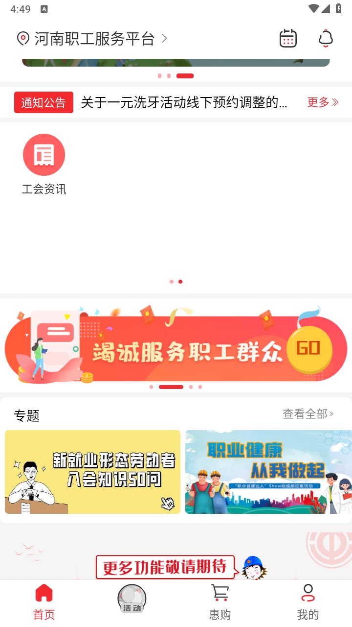 豫工惠app是河南省职工服务中心为广大职工打造的一款福利平台,其中包括最基础的就业服务和技能培训,帮助每一个人完成自己的技能提升,找到最适合自己的工作,还有各种工会福利,福利多多,等待着我们的参加和领取,还有惠购积分商城,购物更加的优惠哈。