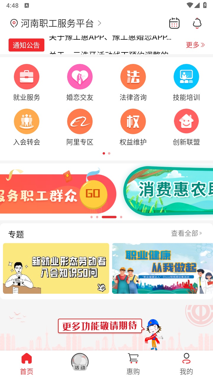豫工惠手机APP是河南工会服务于广大职工的普惠平台,是河南职工服务平台的移动客户端,可为全省职工提供一体化、全方位的工会专属服务。目前,该平台有就业服务、技能培训、法律咨询、入会转会、困难申请、安全隐患、优惠商家、在线阅读等服务模块,还有工会资讯和工会活动等内容。“着眼职工需求,实现职工所愿”,了解详细工会服务和普惠活动,请下载安装“豫工惠”手机APP!