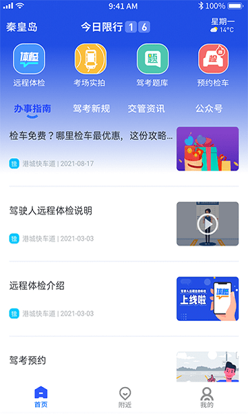 为车主提供省时、省力、省钱的本地化汽车管家服务软件,了解最新的驾考资讯和驾考新规,在线观看驾考视频,平台拥有远程体检,驾考服务,港城检车等等功能服务,同时提供违章查询,交管资讯等,办事指南等更加便捷!