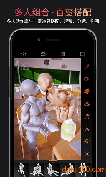 丰富的动作、动画库,通过pofi云端数据库,不定期更新,获取常用pose。贴近各类题材剧情,简单易用,无需熟悉人体结构,即可获得合理的人偶姿势动作。