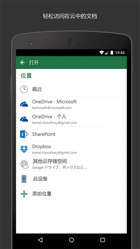 4、有了安卓端的微软Excel应用,一个简单的点击就可以让您随时随地打开文档。您可以把文档存储在OneDrive、OneDrive for Business和SharePoint上,并随时使用多种设备轻松访问。