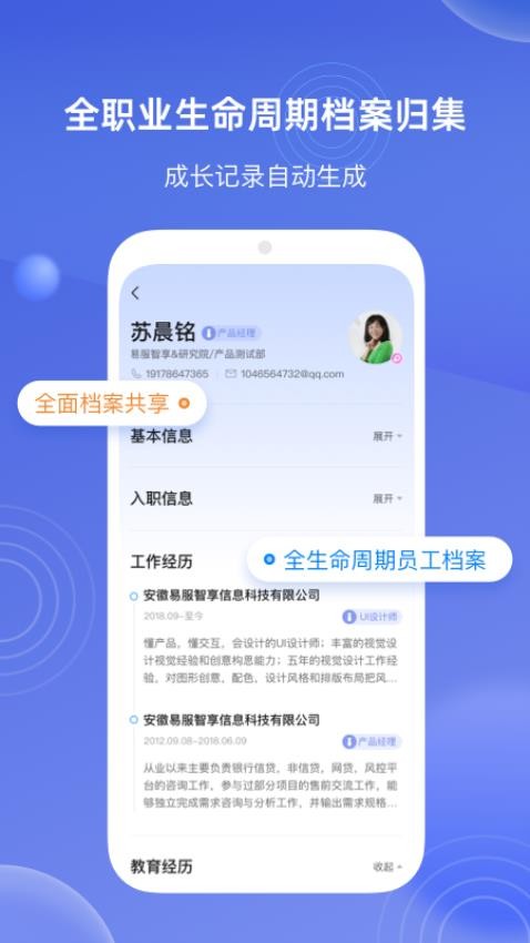 详细的人员档案记录,可全方位知道入职、工作和教育信息;