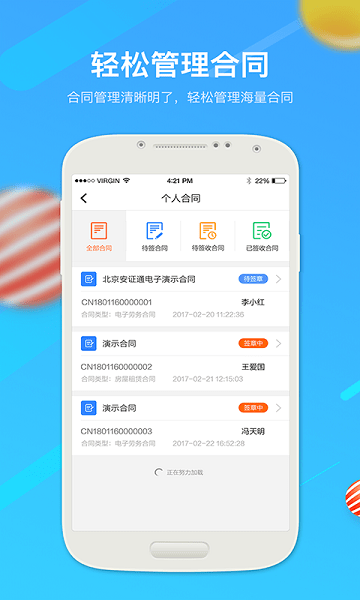 一签通APP是款在移动设备和平板上快速签署PDF文档及电子合同的应用,依托PKI技术、云服务,能够提供在线签署、存储验证于一体的一站式服务,为用户打造快捷、方便、安全、具有法律效力的电子合同签署平台,让用户签署电子合同更方便、更省心。