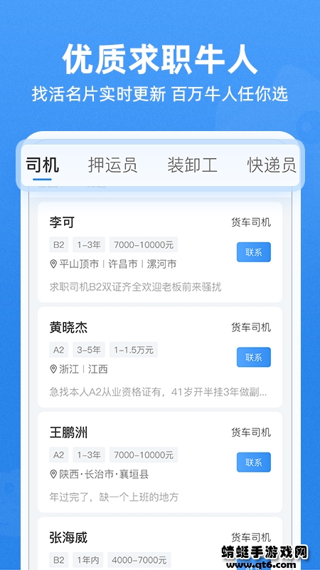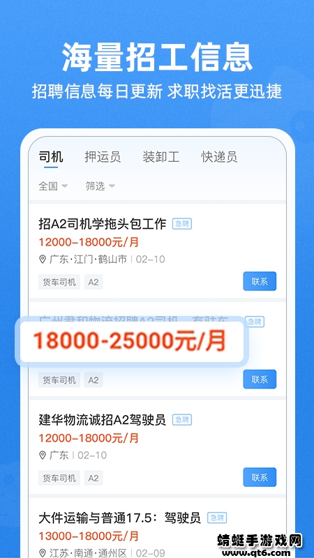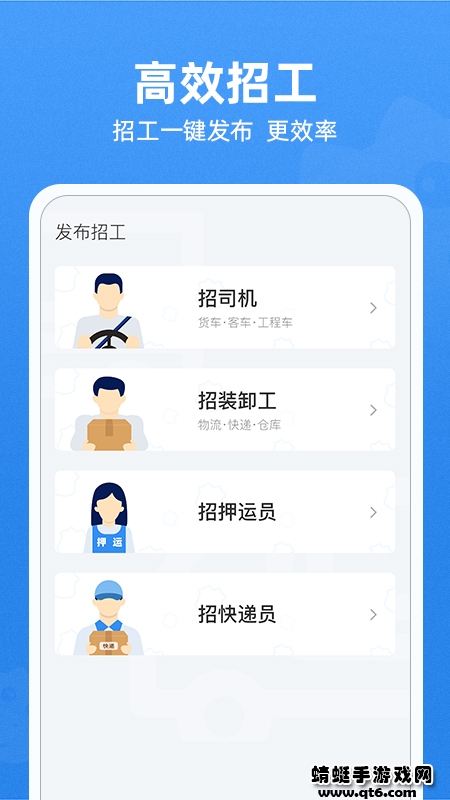 4.每日更新万条司机、押运员、装卸工、快递员招工信息,求职者可筛选联系,也可发布找活名片曝光,提高找活效率。