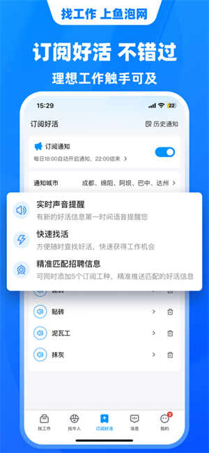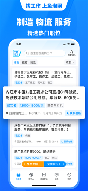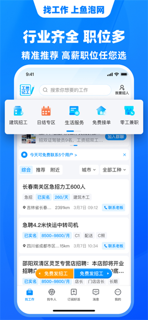 鱼泡网破解版耗子修改版是一款可以帮助用户们轻松找到心仪工作的手机求职应聘类软件,网罗了各行各业的招聘用工信息,适合建筑、装修、服务、工厂、制造、物流等各种不同行业的人员使用,并且我们还可以通过进行筛选,让大家可以快速分辨那些工作更优质,从而找到自己喜欢的工作。不找工作随便看看也能获取积分,这些积分可以兑换各种好东西。