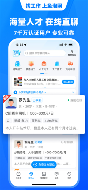3、海量人才放心招:7000多万认证牛人,专业可靠,服务数百万老板招到心仪人才;