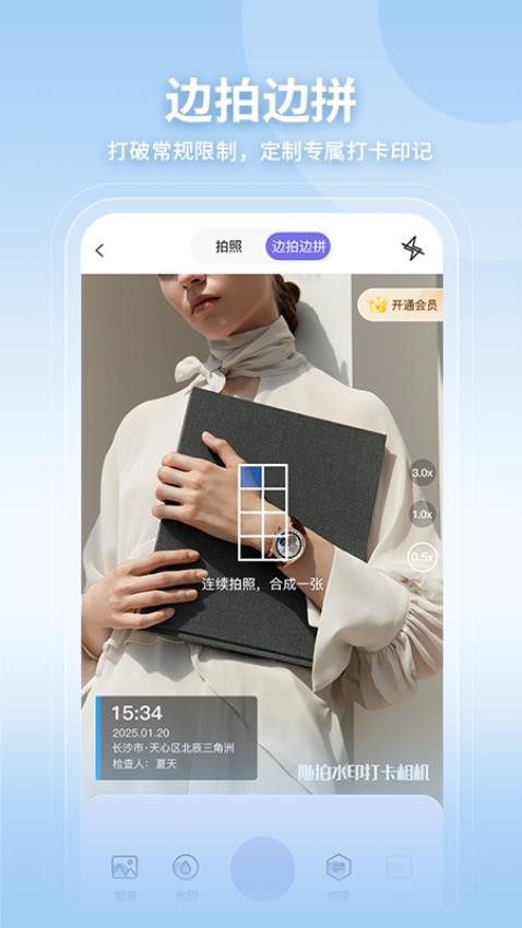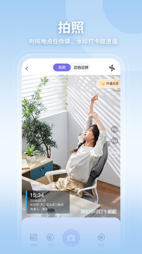 自动水印添加模式,一键拍摄可自动添加水印数据,保存自己出勤的时间和地点等信息;