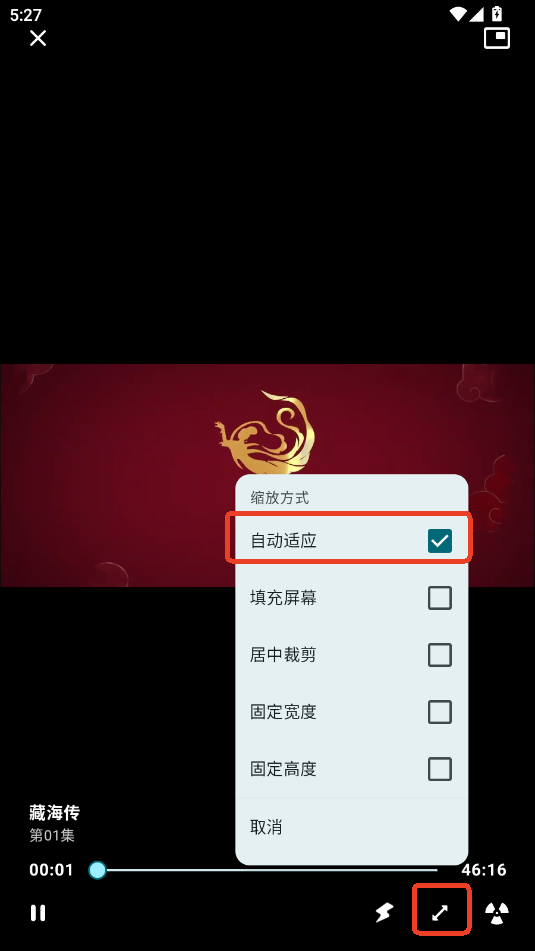 3.左下角的缩放方式选择自适应,横向屏幕即可。