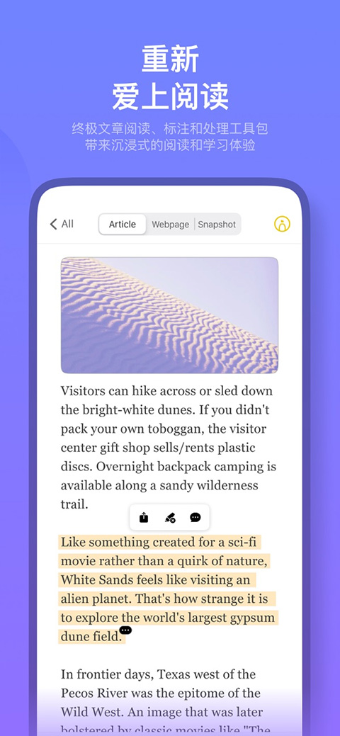 1、识别文章并解析正文,排除无关干扰,以你喜爱的样式进行沉浸式阅读。