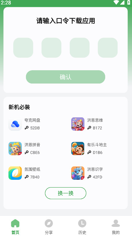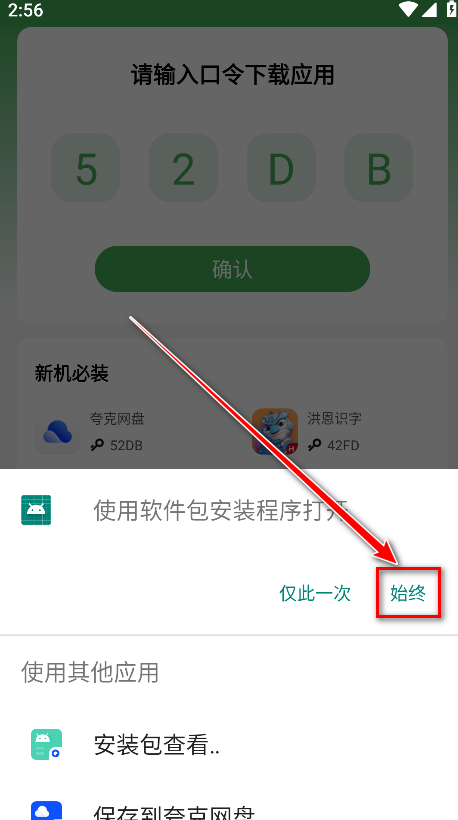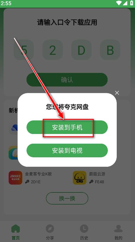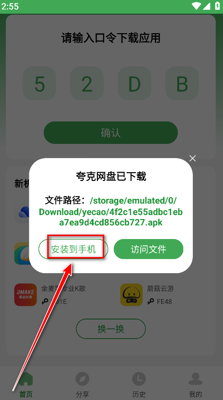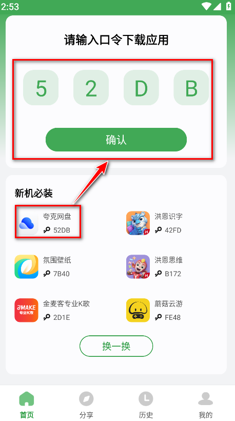 1.打开野草助手,输入我们想要安装的软件的口令,然后点击确认。小编以夸克网盘为例子,输入夸克网盘对应的口令52DB,如下图所示。