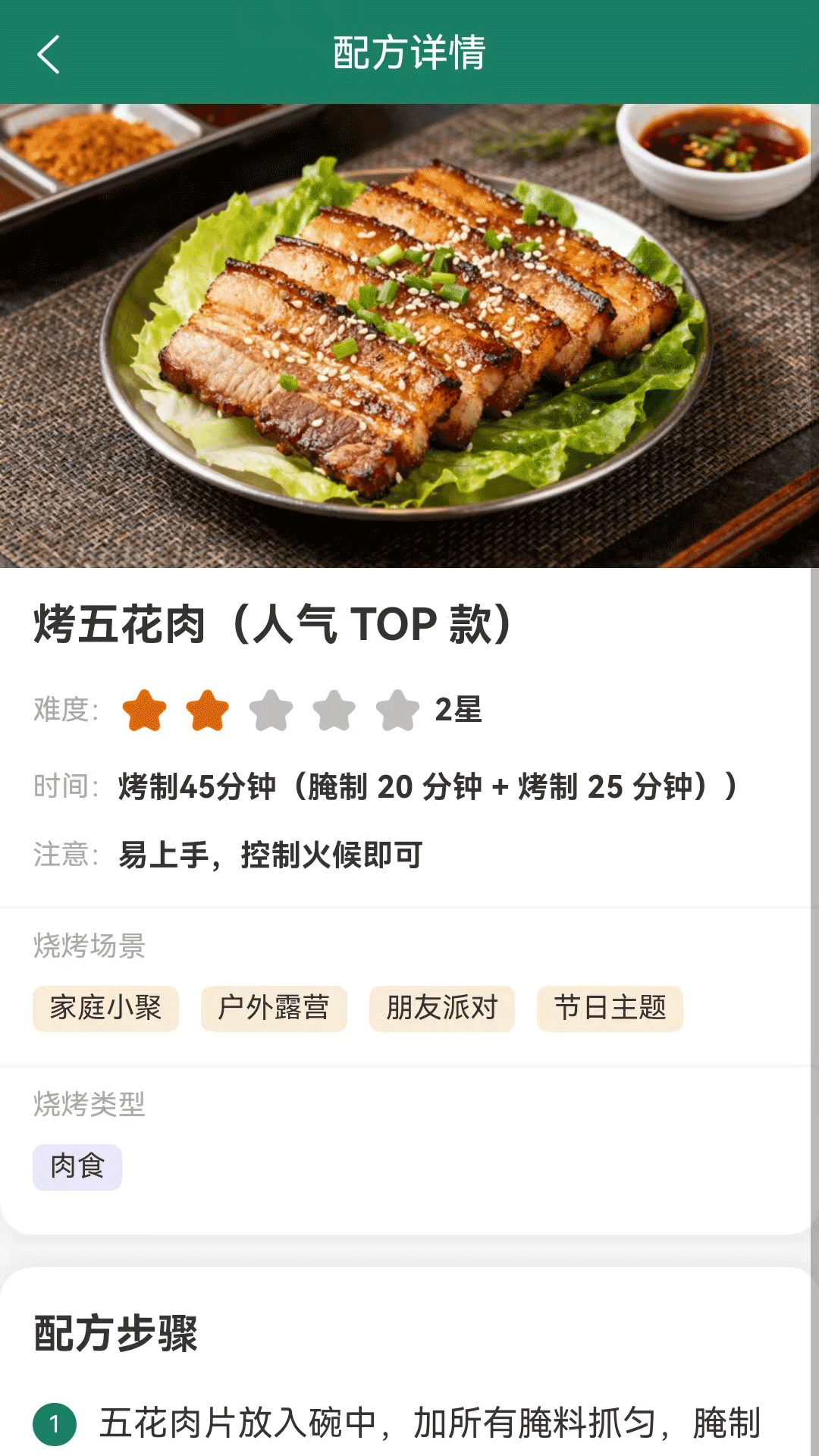 3、不仅因丰富的配方与实用的技巧吸引用户,更在于其贴心的场景适配与个性化的口味推荐,让每一次烧烤都成为一次难忘的体验。