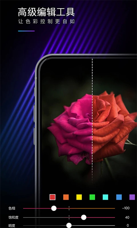 MIX支持15种易于使用的基本图片调整工具,即使没有太多调图知识的用户也能轻松掌握。对于具备一定图片编辑和色彩知识的高级用户,MIX提供了曲线、色相/饱和度、色调分离和色彩平衡等专业的调色工具来释放用户的创意。