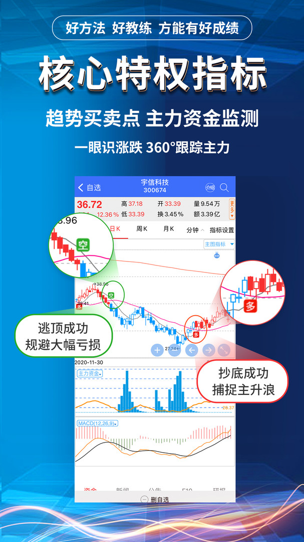 4、趋势买卖点:实时运用“多”、”空“提醒趋势变换,直观提示买卖点建议,让炒股变得简单!