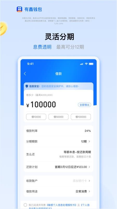 有鑫钱包app最新版是一款合规专业的小额借款软件,软件中最高额度可借20万,用户可以自由选择自己需要的借款额度申请借款,支持用户灵活分期借款,方便用户随借随还,减轻用户的还款压力,让用户随时都可以在这里轻松无压力的申请借款,便捷的借款操作,让用户申请借款更快捷方便,平台会将用户的借款申请极速审核放款,让用户申请的借款资金能够快速到账,解决用户的资金周转难题,其中还为用户准备有金融防诈手册,科普了很多的金融防诈知识,提升全民的安全意识,谨防用户上当受骗,有需要的用户就快来下载有鑫钱包官网版使用吧!
