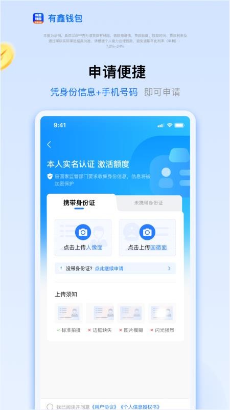 在线申请借款需要用户上传自己的身份证照片进行实名认证,完成实名认证操作。