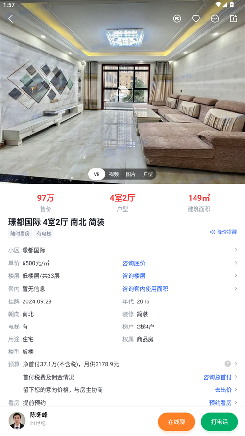 2、选中自己喜欢的户型和装饰,大家还可以自由筛选合适的合适的二手房,里面显示了给房屋各个方位的照片,以及看房信息、有的东西、房东等等。