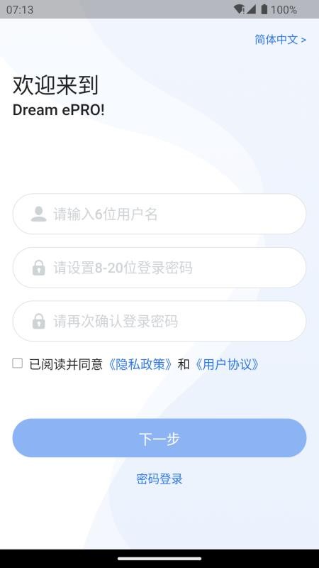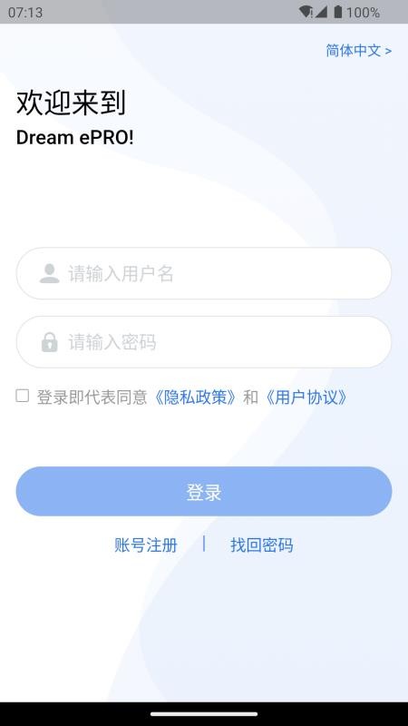 1、在线下载并打开Dream ePRO软件,就能输入用户名和密码登录;