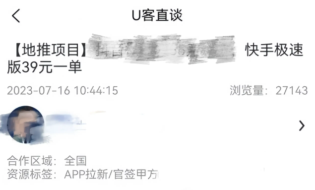 根据U客直谈、闲创无忧、羚羊推客等一些拥有一手单的接单平台显示,快手极速版成功拉新一单的佣金在30-40元之间。