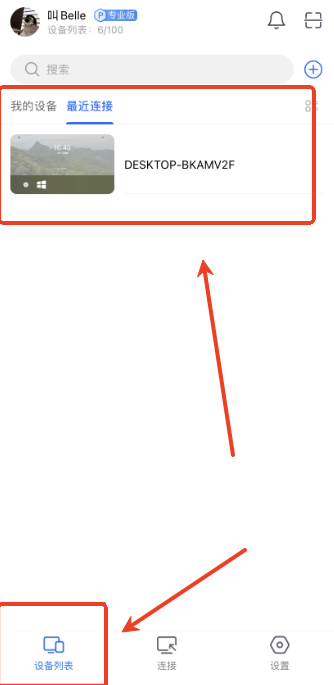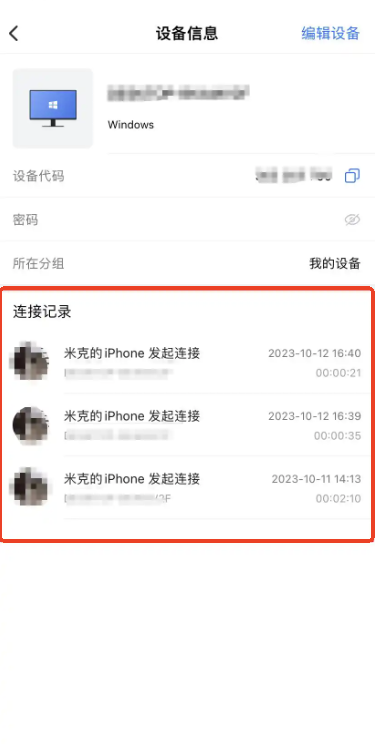2.或者你也可以在设备列表页面的顶部找到【最近连接】,点击连接过的设备进入主页面,找到右上角三个点,点击即可查看设备的详细信息和具体连接时间记录和发起连接人。