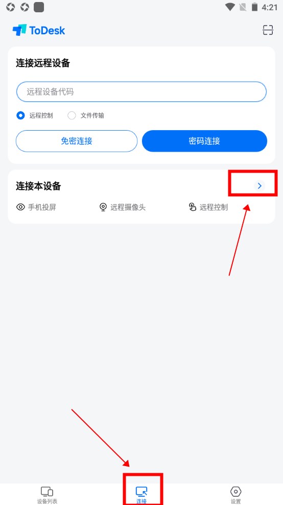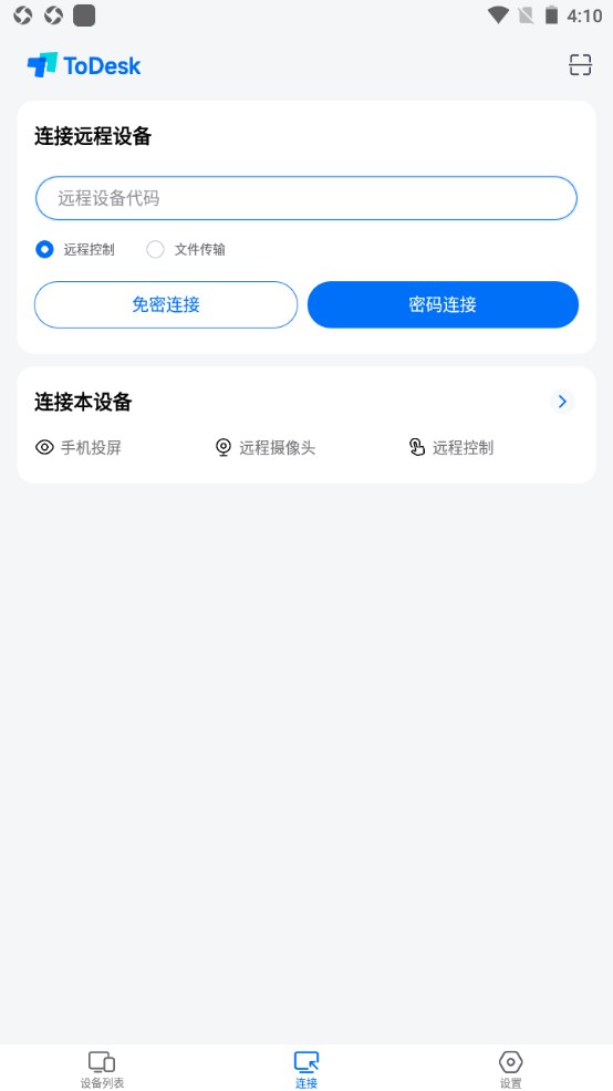 最后,在电脑端ToDesk首页输入手机端的设备代码和临时密码,点击连接,即可实现手机投屏。