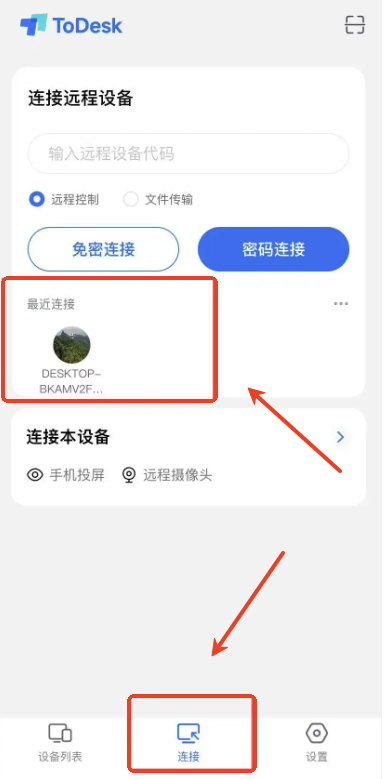 1.打开ToDesk远程软件APP,在连接页面即可找到最近连接的设备,点击即可快速远控连接。