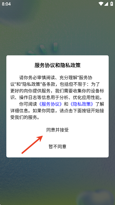 2、阅读服务协议和隐私政策后点击同意并介绍;