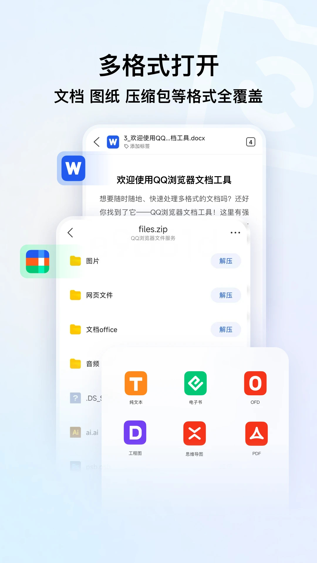 办公文档、文件管理、学习资料一站式快速处理;视频处理、格式转化、拍照扫描、文件解压缩等工具一应俱全