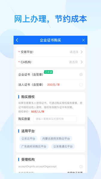 数字证书申请:用户可以通过公采签平台方便地进行数字证书的申请,无需繁琐的线下流程,简化了证书申请的步骤。