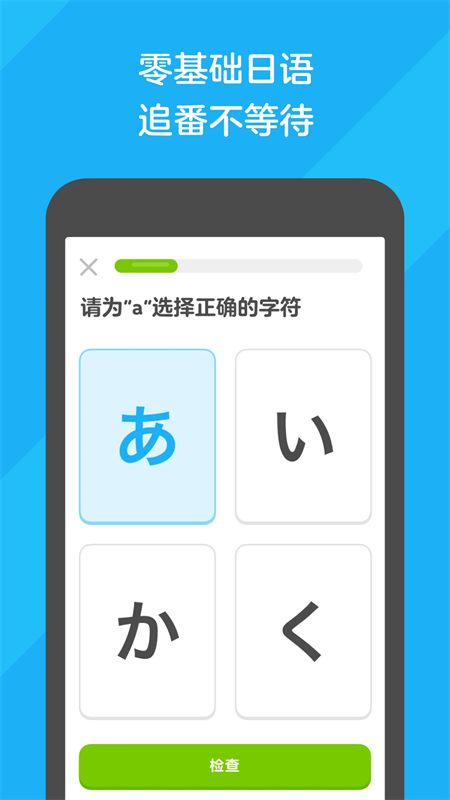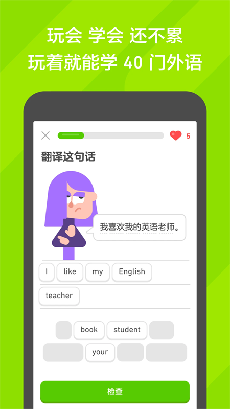 零基础入门,将生活场景分成单元学习,旅行、点菜、聊天、面试...忘掉那些枯燥乏味的死记硬背吧,用游戏闯关的方法,有宝石、红心、王冠,有可可爱爱的动画人物为你加油鼓气,玩儿着玩儿着就学会了。