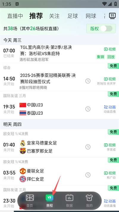 1、进入赛程页面,打开 App,点击底部导航栏的 「赛程」 按钮,进入完整赛事列表。