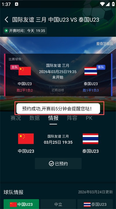 4、确认预约成功,点击后按钮状态会变为已预约,同时 App 会在比赛开始前推送比赛提醒。