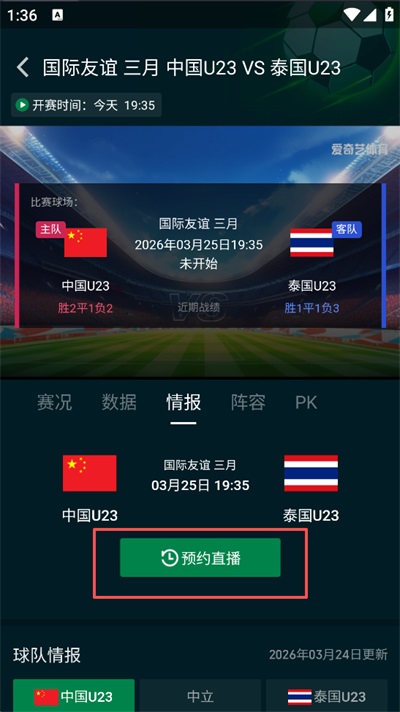 2、找到目标比赛,在赛程列表中,找到 「中国 U23 vs 泰国 U23」 这场比赛。