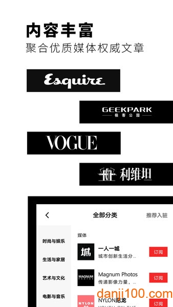 哈佛商业评论、36氪、知乎每日精选、VOUGE中国、LonelyPlanet、虎嗅、ChinaDaily、虎扑…......满足多领域阅读需求。