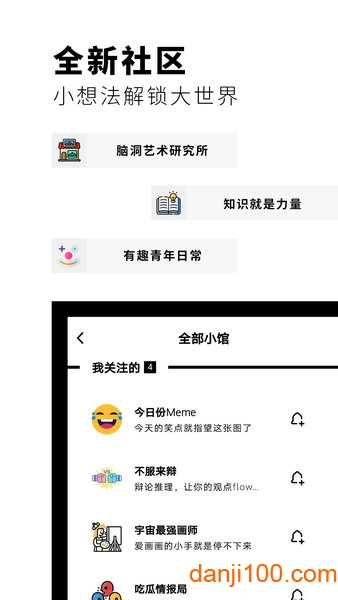 在这里,一目了然找到主题,用思维和你独特的想法创建一方属于你的兴趣空间。不论是健身还是纹身,只要你发布的想法好,我们都能帮你上精选。