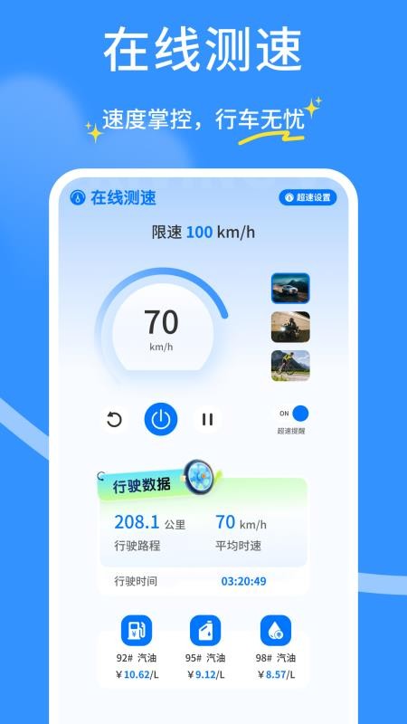 方便用户实时在线测速,可以对车辆速度进行掌控,一键掌握行驶速度。