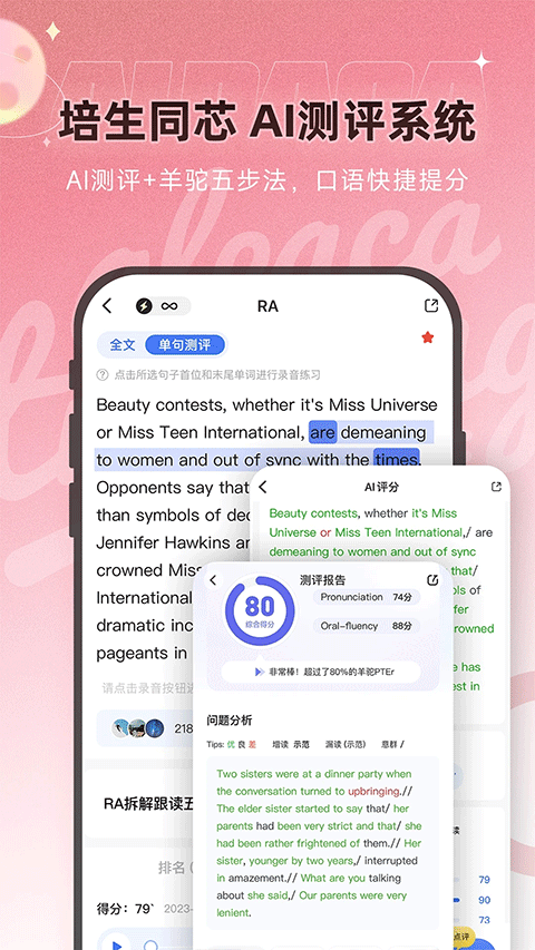 4、RA/RS/RL/DI/ASQ/单词,口语练习测评功能,为英语口语考生揭露音标、单词、句子、段落的弱点所在,提供考试总分、流利分和发音总分让考生参考来对自己的发音进行修正;