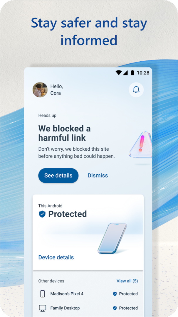 使用MicrosoftDefender无缝保护数据和设备。1你和你的家庭可在一款应用中使用通知、专家建议和安全提示轻松管理在线安全,从而帮助你保持在线安全。个人版MicrosoftDefender需要Microsoft365个人版或家庭版订阅。