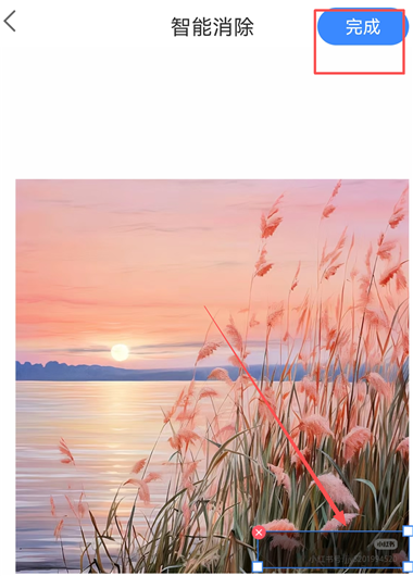 2、导入带有水印的图片,拖动消除框到水印的地方,点击右上方【完成】。
