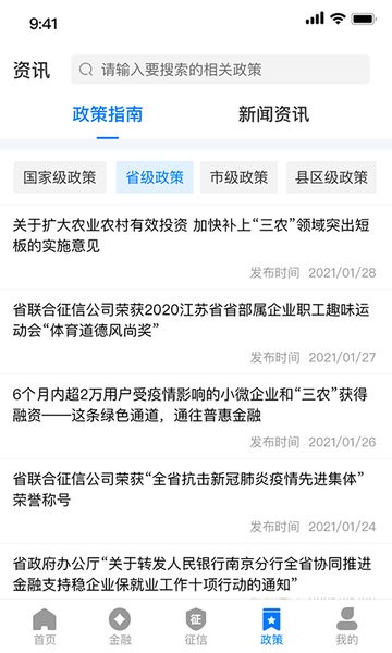 江苏金服官方平台是由江苏联合征信有限公司推出的金融服务app,个人用户以及企业用户可通过该软件查询各类金融产品以及征信情况,还有各种政策内容,帮助您更好的进行投资以及合作。