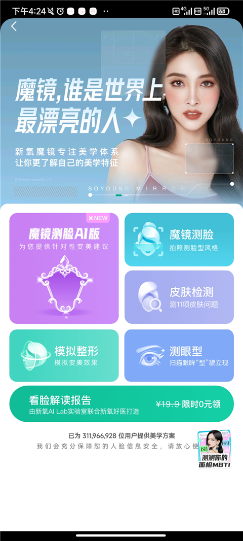 3. 具备智能测脸功能,新氧魔镜自主研发AI美学诊断,一键测脸,精准定义独特之美。
